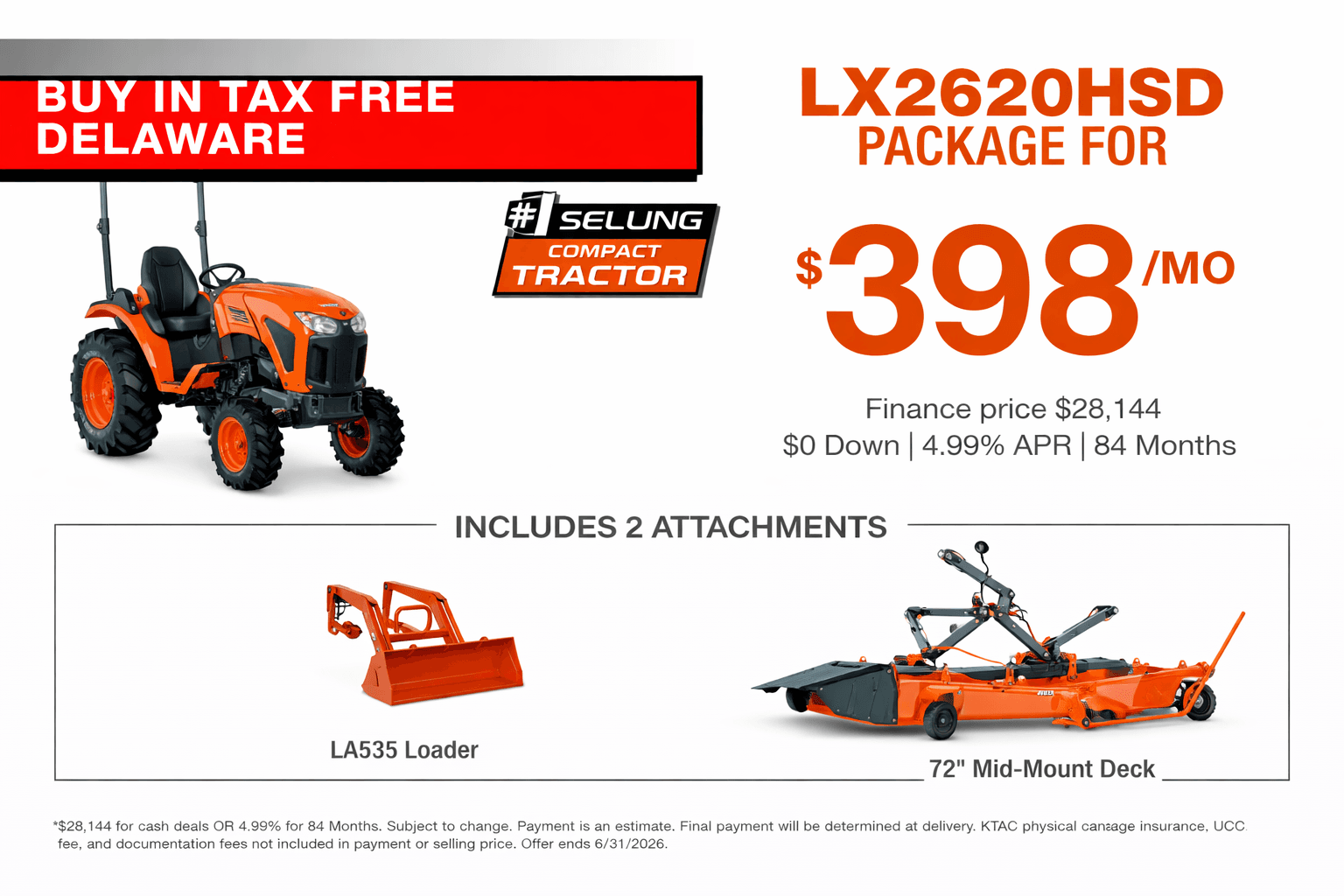 4.99% for 84 months ends 6/30/2026. All customer discounts have been applies to the selling price. Payment is estimated. KTAC Insurance, Documentation Fee, and UCC Fees not included. Final payment will be determined at the time of delivery.