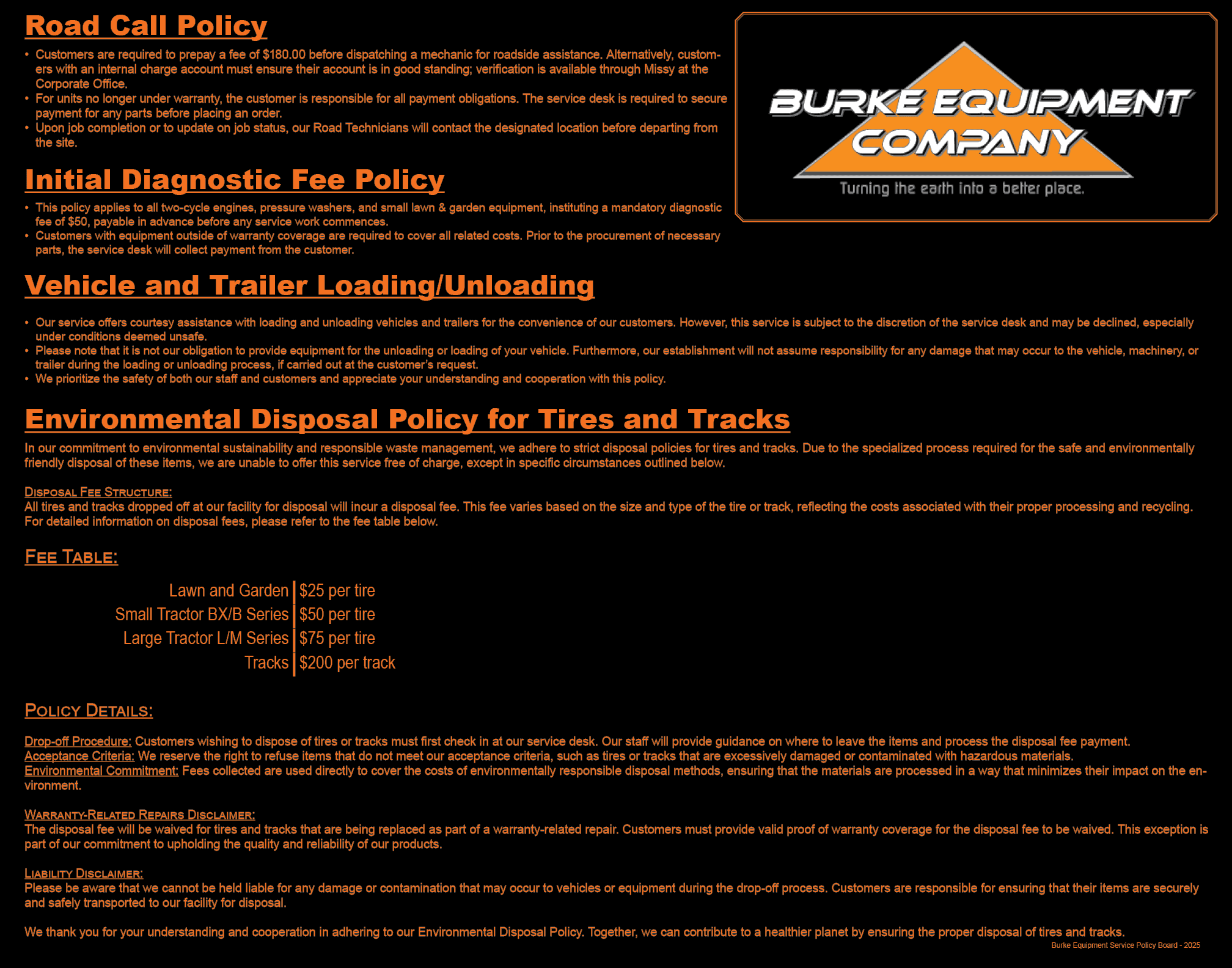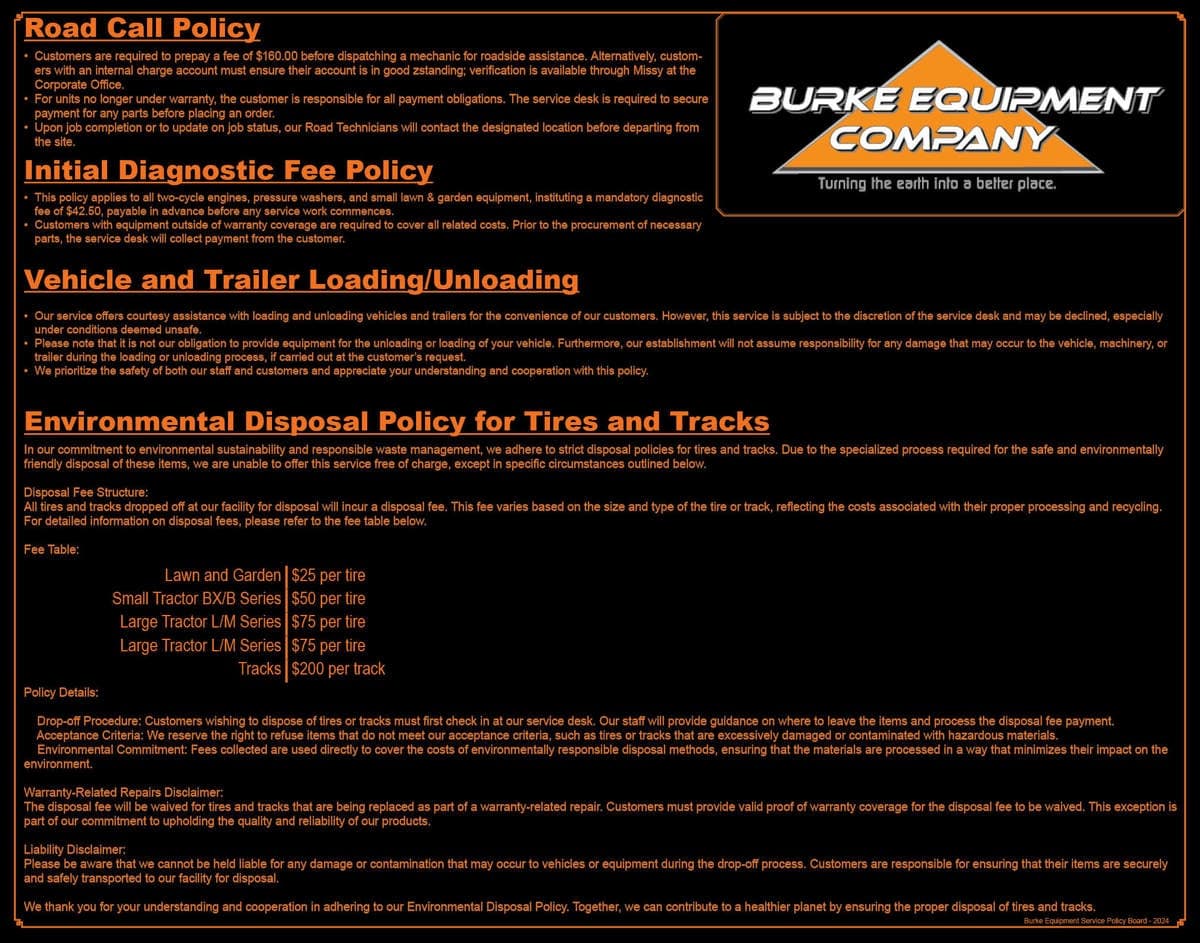 Burke Equipment Company is the Delmarva leader in Quality of Service. We provide on-site service as well as complete shop service for most tractors, equipment, and implements. From the simple oil change to complete engine overhauls, let Burke Equipment Company maintain your equipment and solve your problems.